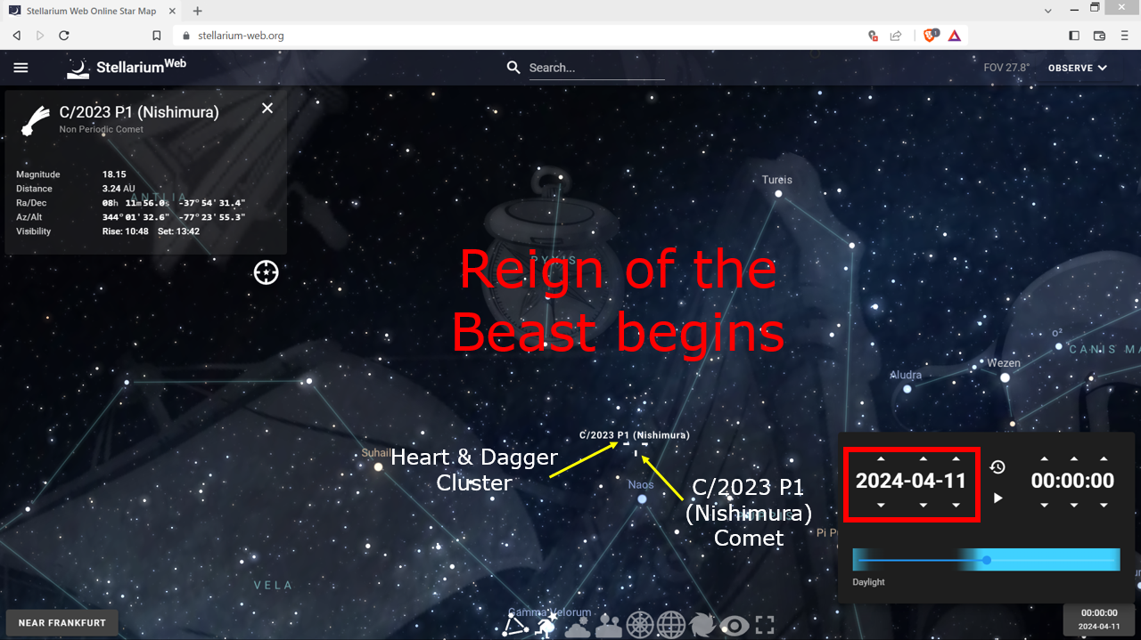 The timeline framework for when the reign of the Beast (Antichrist) begins is when the C/2023 P1 (Nishimura) Comet passes the Heart and Dagger Cluster and circles within the area shown in the yellow ellipse of the image below. This is an amazing part of the comet's journey that shows just how powerful God truly is!