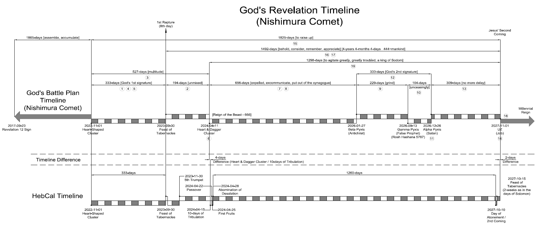 Now that we have individually studied each of the precise waypoints of the Nishimura comet, and transcribed their purpose utilizing day counts and Strong’s Concordance as a cipher, we can now compile all of the data points into God’s Revelation Timeline shown below.