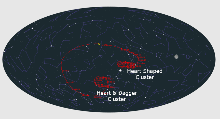 On April 4, 2024, the C/2023 P1 (Nishimura) Comet will pass the Heart and Dagger Cluster at their closest proximity. It's interesting to note the name of this star cluster, "Heart and Dagger." This will become clear shortly.