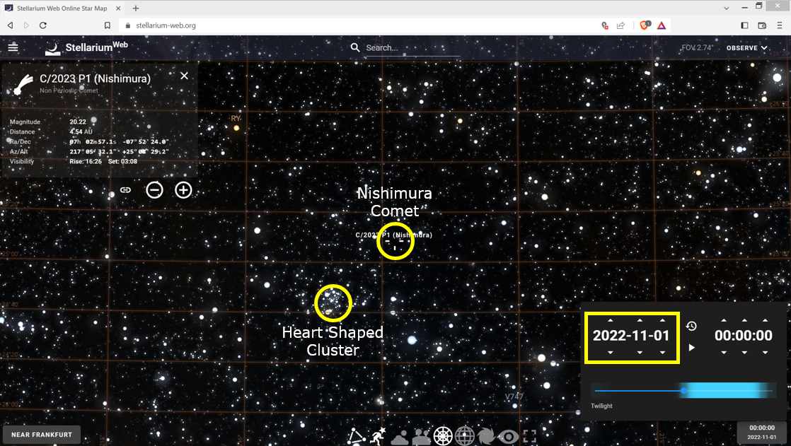 After selecting the second result in the list, Heart and Dagger Cluster, sure enough, I could see that it was located in a general area where Nishimura would be in the future. Selecting the Heart Nebula directed Stellarium completely away from any potential encounter with Nishimura, where I thereby ignored the query result.