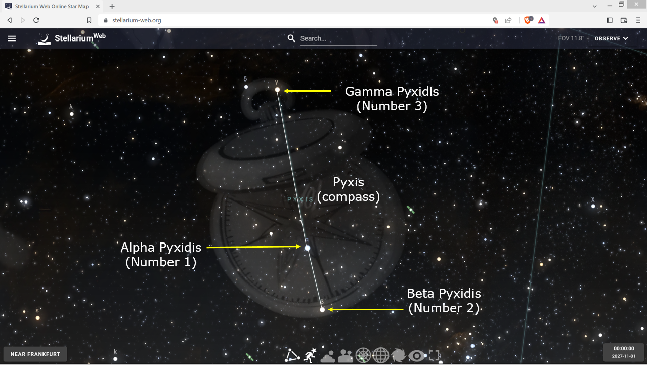 In the image below, where we are still on the same day of April 4, 2024, when Nishimura passed the Heart and Dagger Cluster, you will notice the constellation above in the yellow circle. This is the constellation Pyxis. It is known as the “compass,” which is resembled in the artwork.