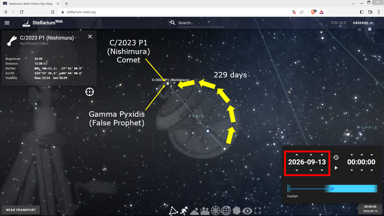 These two images below span one day, showing where the Nishimura comet will be on the first day of the Feast of Tabernacles in 2023, which is the first day we could have been changed from mortal to immortal in a twinkling of an eye. (Remember this very important fact because 2024 is a second chance. We are running out of chances!)
