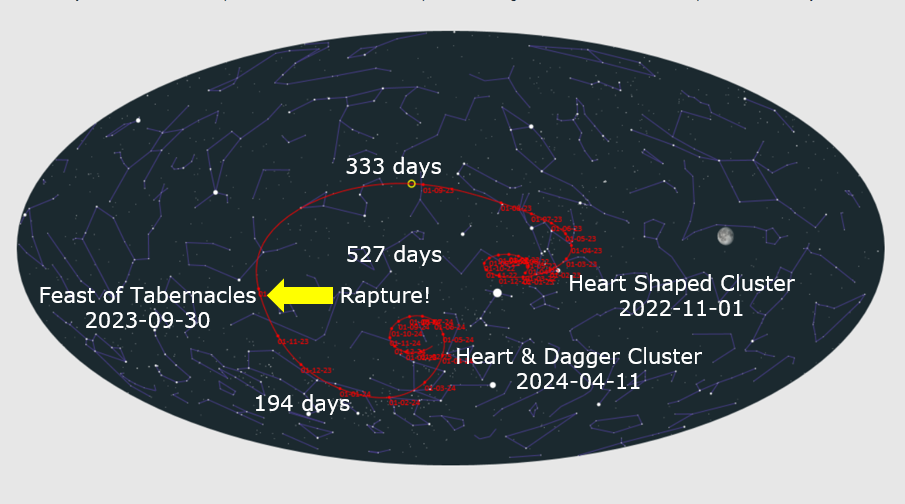 Look at the image below. There are 333 days from when the Nishimura Comet passed the Heart-Shaped Cluster on November 11, 2022, and the first day of the Feast of Tabernacles on September 30, 2023. What are the odds? There are none. God intended it to be so. This is statistical impossibility #1.