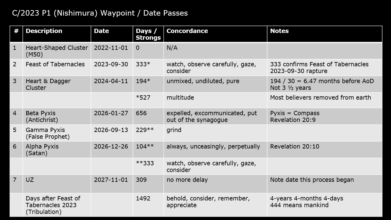 The table below summarizes the comet’s waypoints, date, days from previous waypoint, associated Strong’s Concordance cipher message, and a few notes of interest.